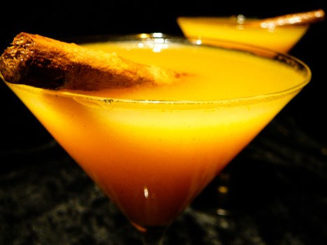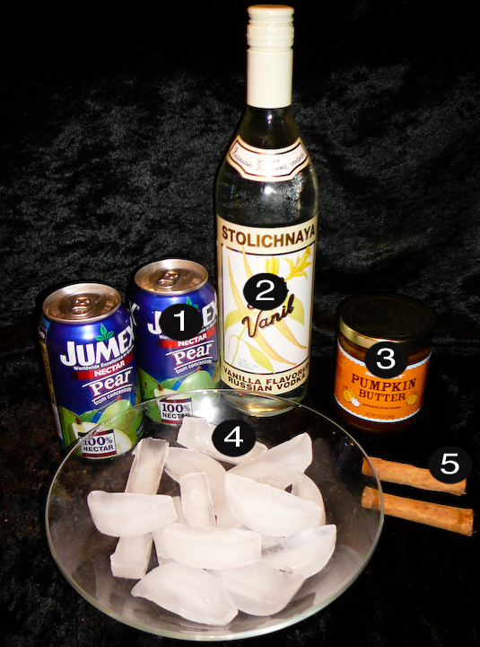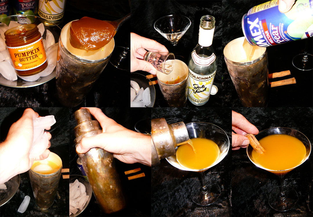 Combine the pumpkin butter, vanilla vodka, pear nectar, and ice in a martini shaker. Shake it vigorously like you did in high school when you couldn’t get banged if your dweeby life depended on it.  Pour the contents into a martini glass and garnish with a cinnamon stick.