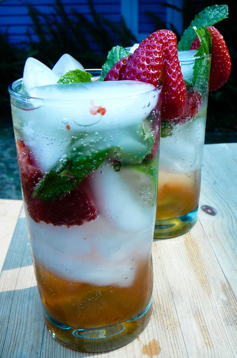 Fill each glass halfway up with ice. Squeeze ½ a lime into each, dropping the rinds into cup. Crush the strawberries in your hands and drop into the class. Toss in a small handful of mint leaves. Pour in the tequila. Fill the rest of the glass with club soda and top each glass up with ice.