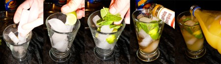 Fill a glass with ice, squeeze in the limejuice, and add some mint leaves. Pour in the sumptuous liquids, mix, and guzzle. Yo ho yo ho, a pirate’s life for we.