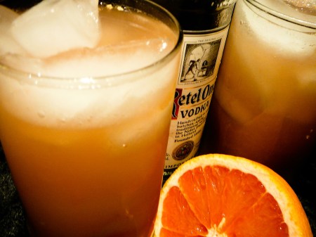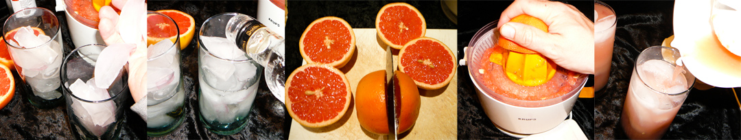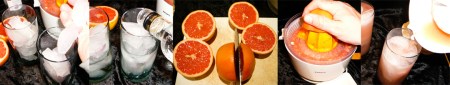 Fill up each glass with ice and pour in your vodka. Fresh squeeze the grapefruits and fill glasses to the brim. Stir and serve. Lock and load.