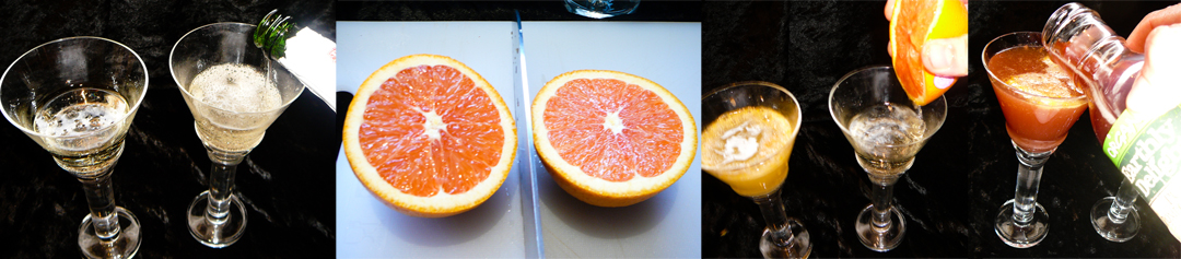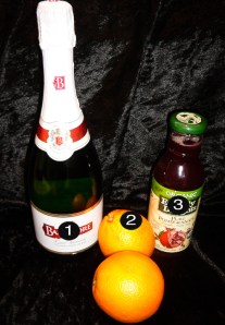 Fill each glass halfway with champagne. Cut the oranges in half and squeeze the juice into the glass. Top off each glass with pomegranate juice and you are ready to rock.