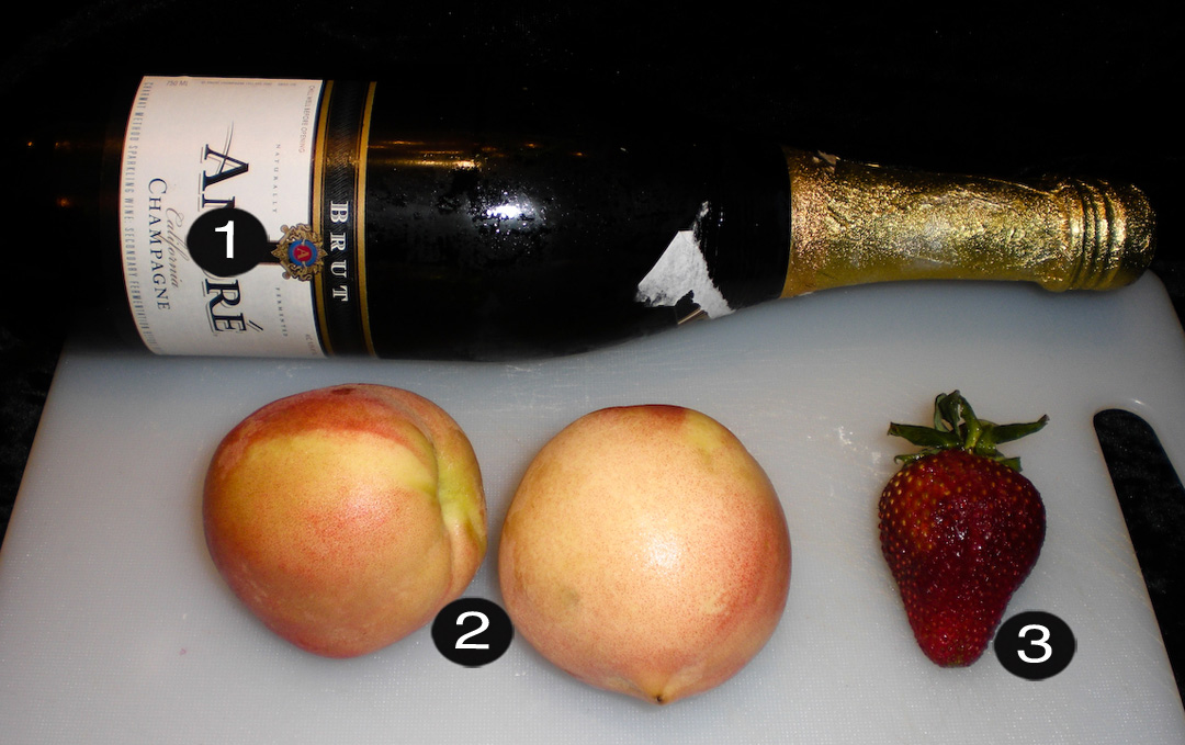 Chop up the peaches coarsely. Throw the in a blender with enough champagne to help them puree.