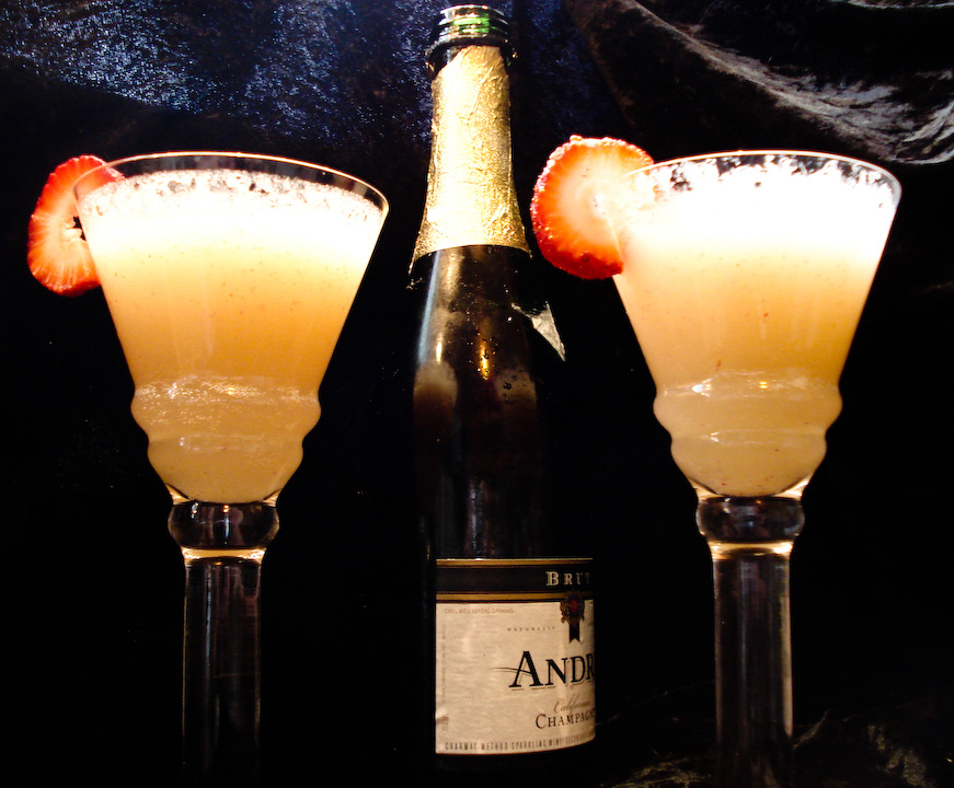 Most of us can’t claim to have a 100-foot yacht, 10 personal assistants, and our own private island. That privilege belongs to me. These lavish riches are made possible by blogging about cooking and banging in my drafty garage. Sorry, suckers. But fear not, for you can simulate this dilettante existence with a few simple adjustments: Cook with real potatoes rather than microwave tater tots you bought with food stamps; light your dining room table with candles instead of your Winnie the Pooh nightlight; make a classy drink from scratch rather than drink 3 bottles of Night Train in front of the Home Depot. Easy enough even if you don’t light your Cuban cigars with $100 bills like me. May I introduce this bubbly taste of class known to the civilized world as the Bellini? It’s like a Mimosa remix that keeps them coming back for seconds, thirds and their tenth glass. And what perfect timing with Valentines Day around the corner! Serve this with dessert or the morning after following a night of carnal consummation. You could also just pour it all over your naked body and invite your sweetie to lick you clean. Regardless, know that you are in fact a peach.