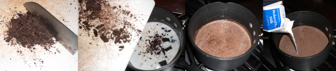Chop the bittersweet chocolate up into shards.  Heat 2 ounces worth of milk in the pot on very low heat until it becomes hot.  Add the chocolate and melt it all together until it’s a thick, divine goop.  Pour the rest of the milk in and heat up, making sure never to boil the concoction.