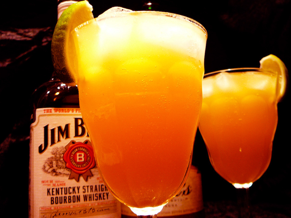 Fill each glass with ice, and then pour in the bourbon, champagne (wait until bubbles subside) and peach juice. Garnish the glass with a lime or peach wedge. Repeat until you are both sloshed and naked.