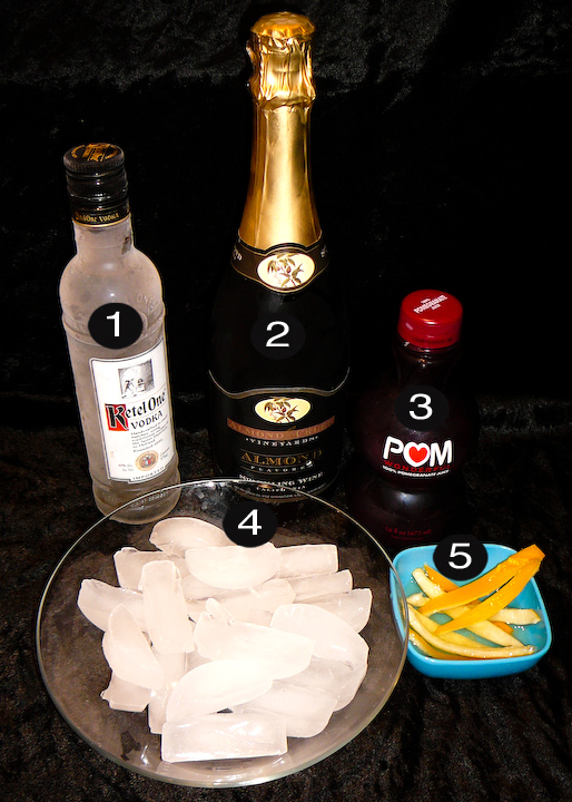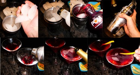 Load the martini shaker with ice, vodka, and pomegranate juice. Shake like the champion you are and pour into the martini glasses. Fill each glass to the brim with champagne and throw in a lemon peel slice for extra taste and appearance.