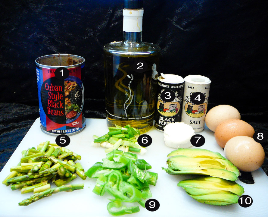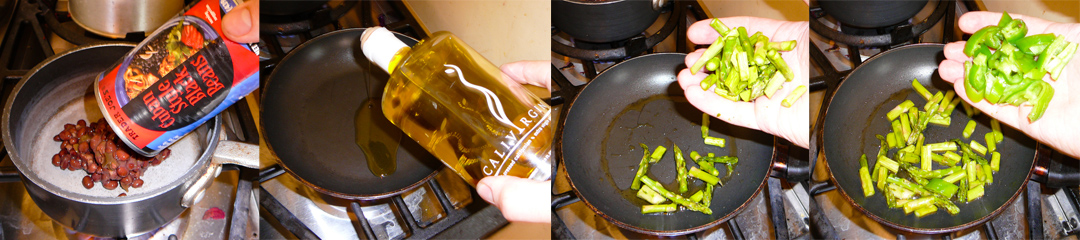 Heat up the black beans with one pot. Sauté the asparagus and green chili with the olive oil.