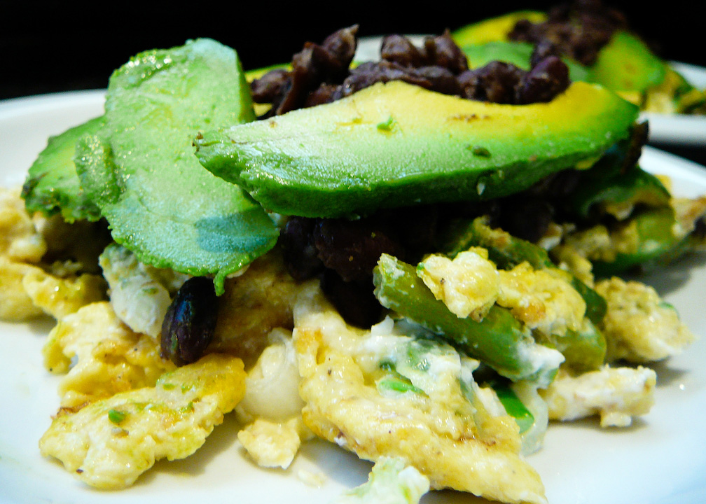 Pour the eggs into the sautéed veggies and scramble. Crumble in the goat cheese so it melts into the eggs. Split the eggs up between 2 plates. Crown the eggs with the black beans and avocado.