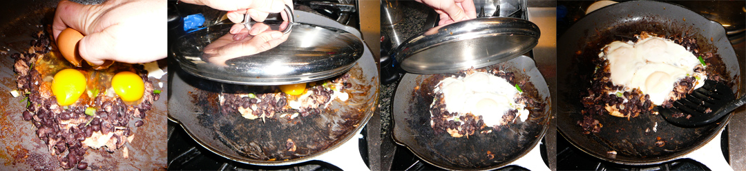 Crack the eggs over the mixture and cover with a pot top so they will cook from steam rising (approx 3 min). Add extra salt if you desire and crown with the green onions.