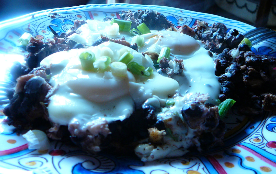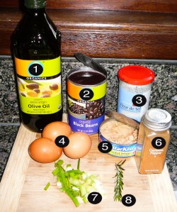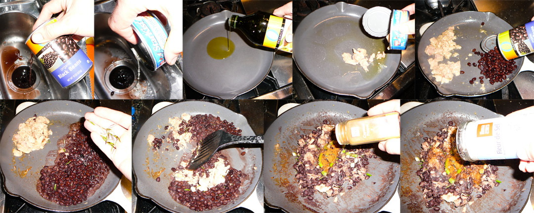 Drain the black beans and tuna cans. Sauté the beans and fish in olive oil, adding rosemary, cayenne pepper, and sea salt.