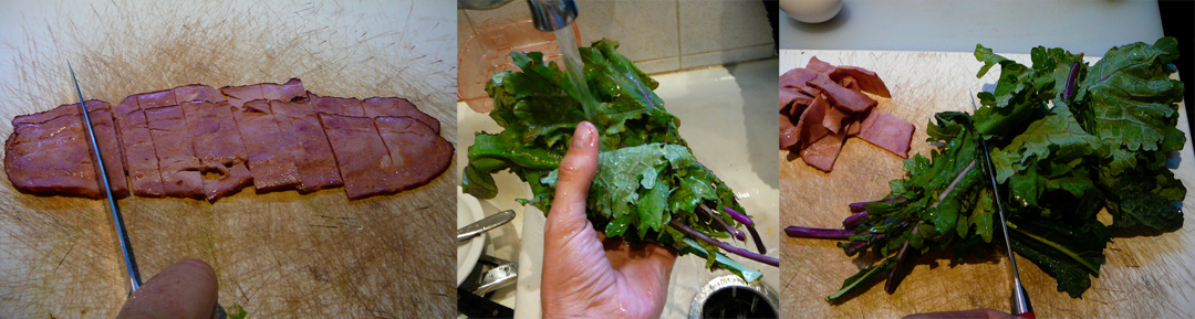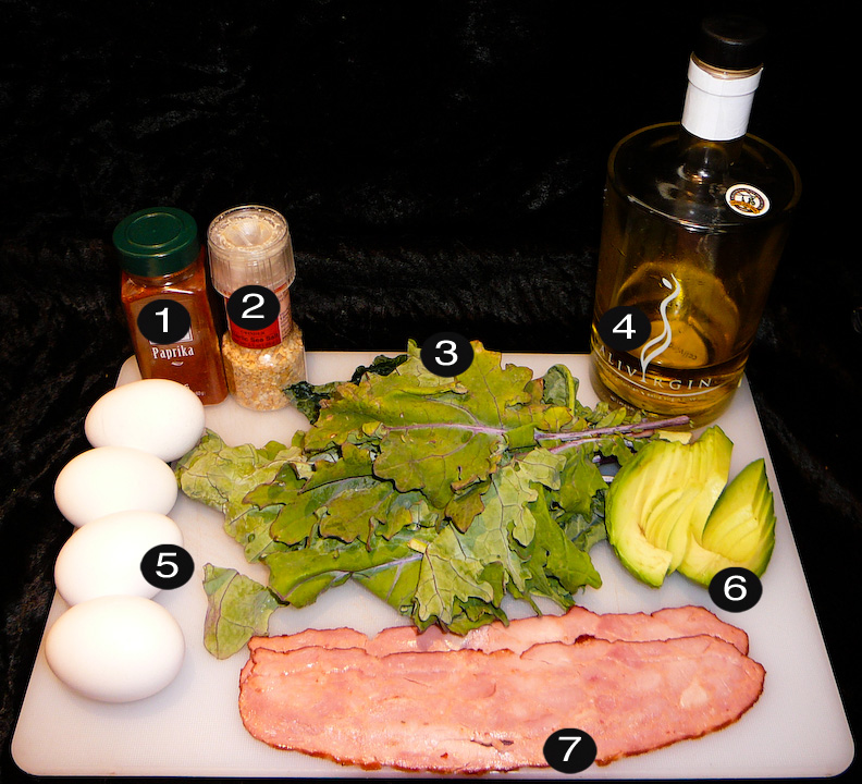 Fry the bacon in the olive oil until crispy. Throw in the chard and cook down (approx 2 min). pour in the eggs and ever so slowly scramble so they form in slabs of eggy goodness. Top it off avocado slices and prepare for liftoff.