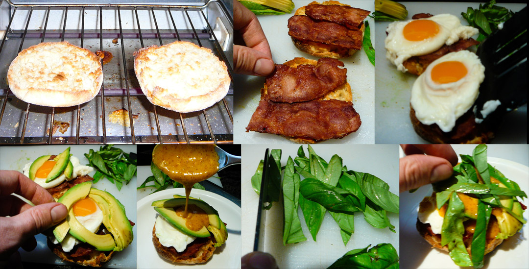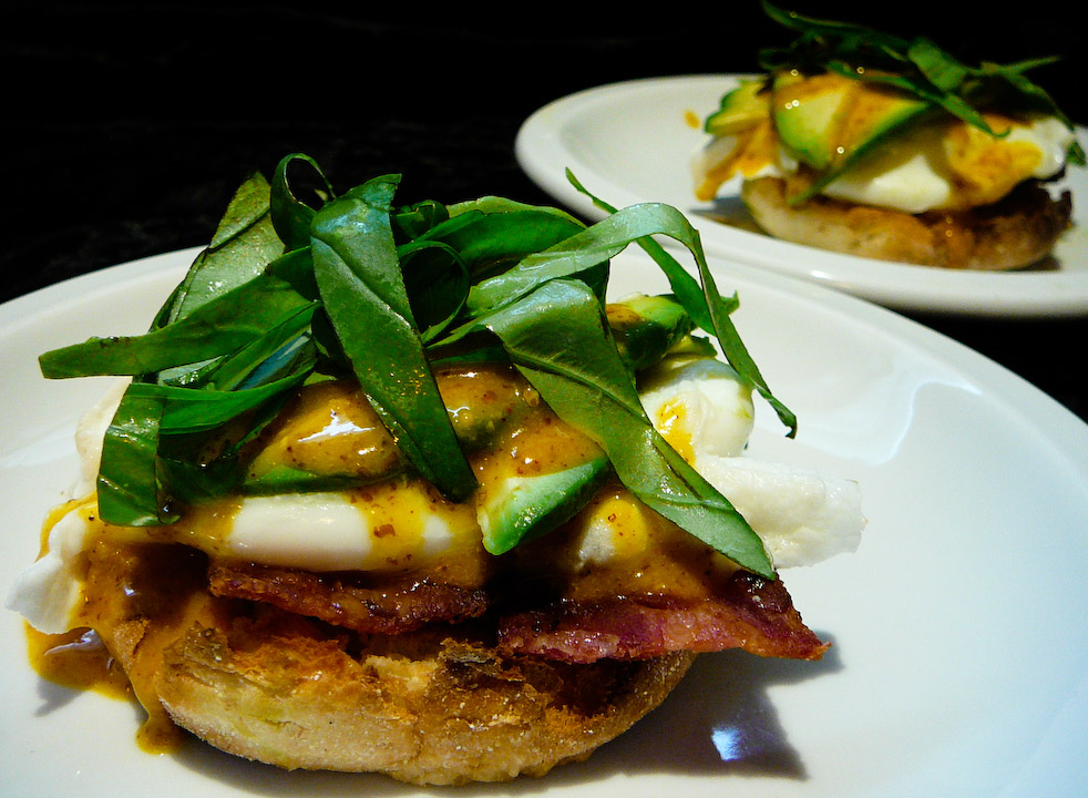 Toast the English muffin and assemble the Eggs Beg-A-Dick: bacon, poached egg, avocado, hollandaise sauce and top each one off with chopped basil.