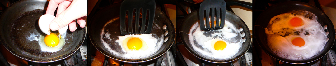 Poach the remaining eggs in a thin pan of boiling water, using a spatula to create 2 separate eggs. Cook until the egg whites cook through, but the yolks remain gooey (approx 4 min).