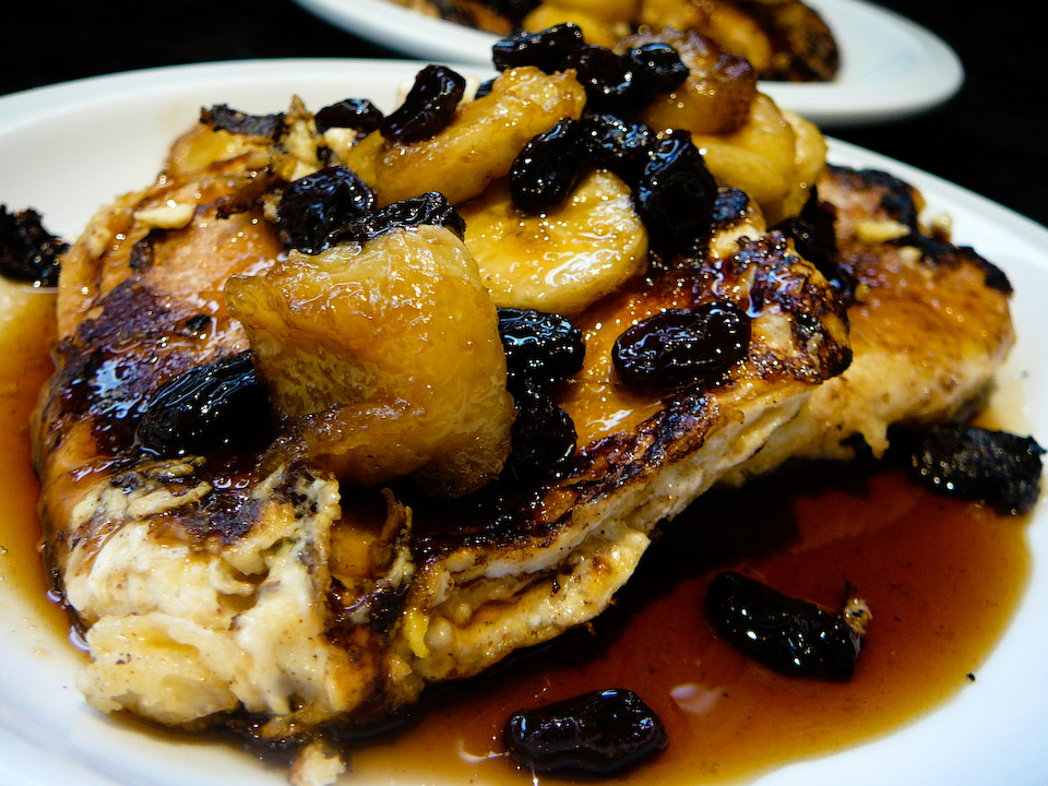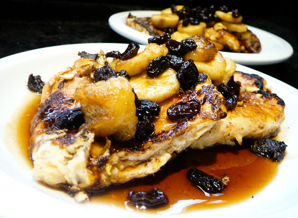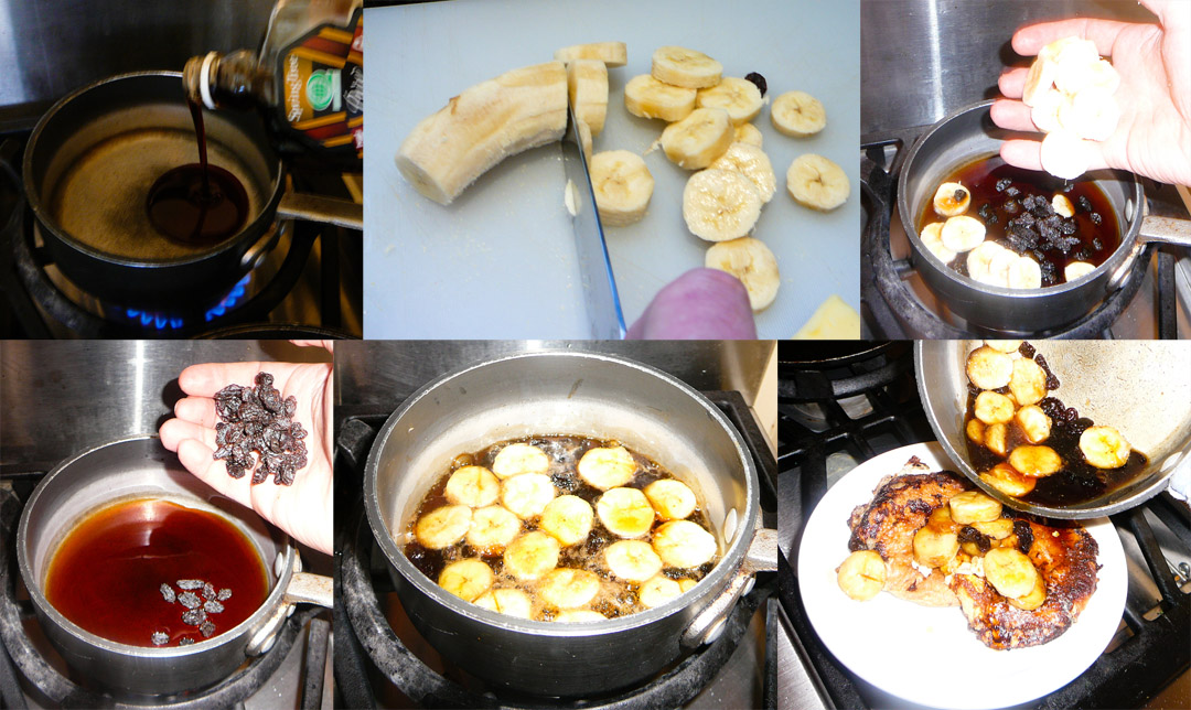 While you are Frenching the toast, create the extra awesome syrup. Heat up the syrup in a small bowl, chop the banana into bite-sized pieces and toss them in with the raisins. Cook until the syrup boils and the bananas brown slightly (approx 2 min). Serve over your sexed up English muffins and hold on for dear life.