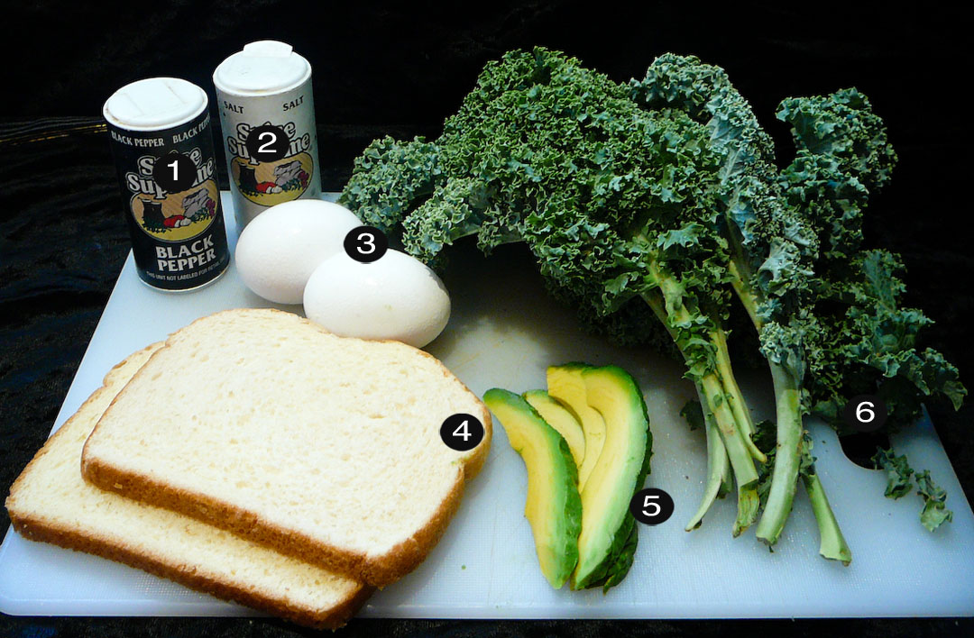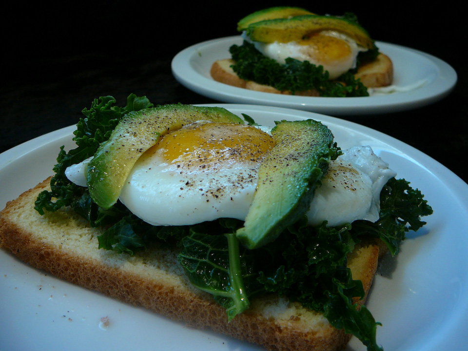 Place boiled kale evenly between the two slices of bread.  Throw the poached egg on top and crown them with slices of avocado.  Add a dash of salt and pepper and voila!