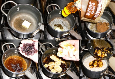 While the oatmeal cooks, make the mixture that will take your breakfast from 0-to-banging in nothing flat. Melt the butter in a saucepan on medium-low heat. Mix in the honey and brown sugar to make syrup. Add the raisins and bananas and cook slowly until oatmeal is ready. Pour in the magic and off you go!