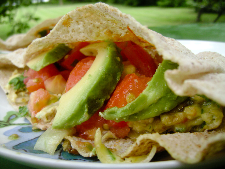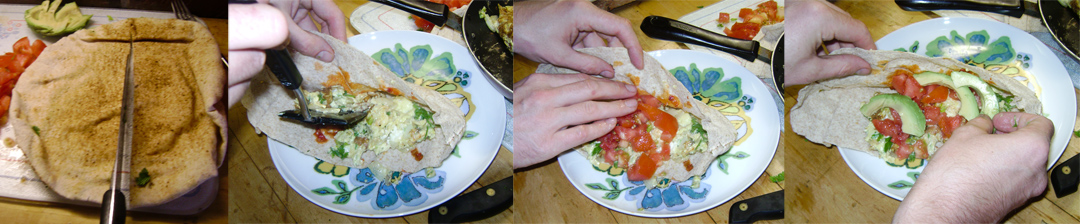 Split the pita in half and open up the middle. Stuff half the eggs into each, followed by the tomato and avocado.