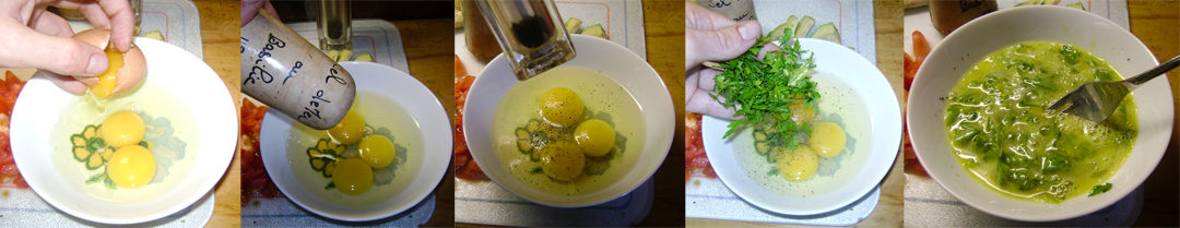 Sauté the onion in olive oil (approx 2 min). Dump the eggs into the pan and scramble (approx 3 min), crowning it with the feta cheese.