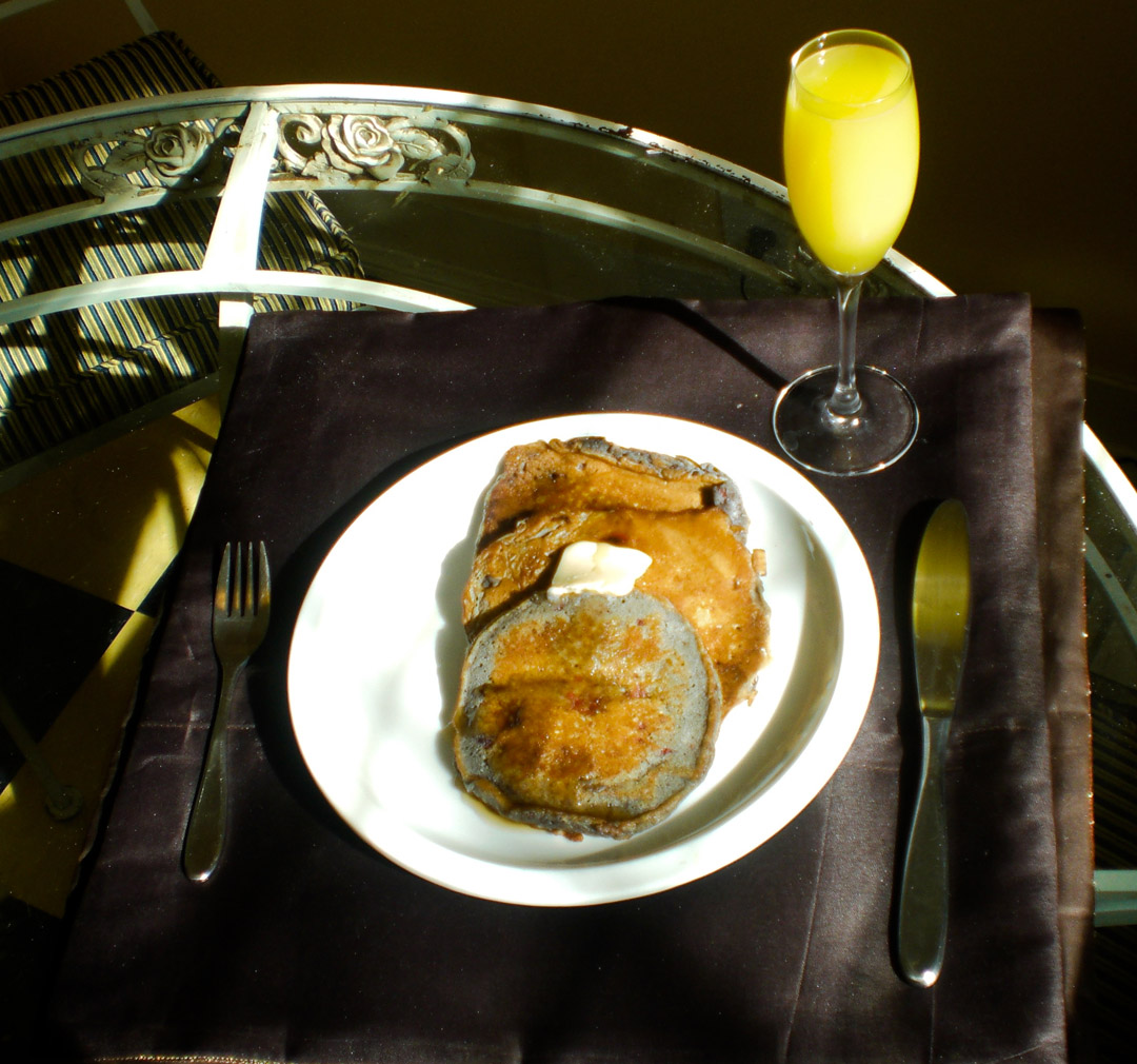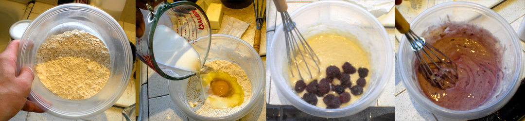 So you’ve just wrapped up a sexual escapade that lasted all morning. Your date is ravenous and is threatening mutiny if you don’t fill their gullets stat. You can do nothing and risk never hearing from them again, which may be the right choice if it’s some skank or bozo. But chances are you wouldn’t have allowed them to stay the night if they weren’t worth making a little effort to feed. If all goes to plan, the afternoon can be a sequel to the morning’s kinky adventures between the sheets. This recipe originated from a severe lack of ingredients. I had only one egg, frozen blackberries and a very hungry girl in my bed. So I improvised and made the morning carry on into the evening, flaking on set plans to have dinner with my mother. Sorry, mom! She forgave me and my date did not erase me from her phonebook. One last thought, why settle for bisquik and water, when the from scratch method takes two extra seconds and yields randy results?
