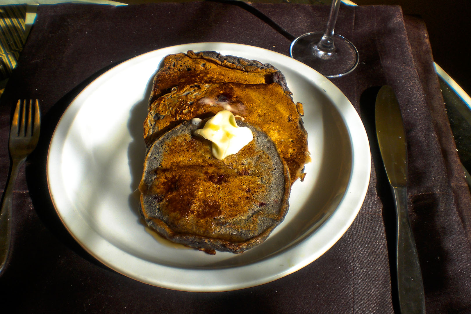 Heat up a pan or griddle on medium heat and grease with butter. Pour the batter in 4 inch diameter round patties. Cook each side until they brown (approx. 2 minutes per side), flipping only once. Serve the pooncakes up on plates with a little butter, syrup and, if you are feeling extra sexy, fresh fruit.