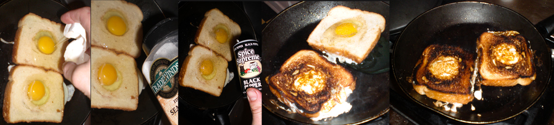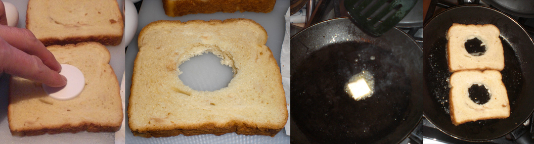 Use a large bottle cap (like for juice) and put a hole into the middle of each slice of bread. Melt the butter in a pan on medium heat and then throw in the bread.