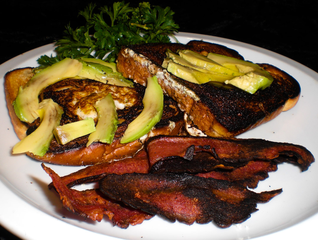 Crack an egg into the center of each hole. Sprinkle the desired amount of salt and pepper on each egg (approx 2 minutes). Once the egg whites start to escape and harden from under the bread, flip them and cook the other side making sue the yolk is still soft in the middle (approx 1-2 minutes). Serve it up on a plate with the side you cooked first up, its much prettier, and crown with avocado slices. Serve with bacon or hot sauce if you like.