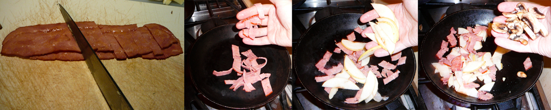 Chop up the bacon in small slices and sauté in a pan with the pear and mushroom slices (approx 3 min).