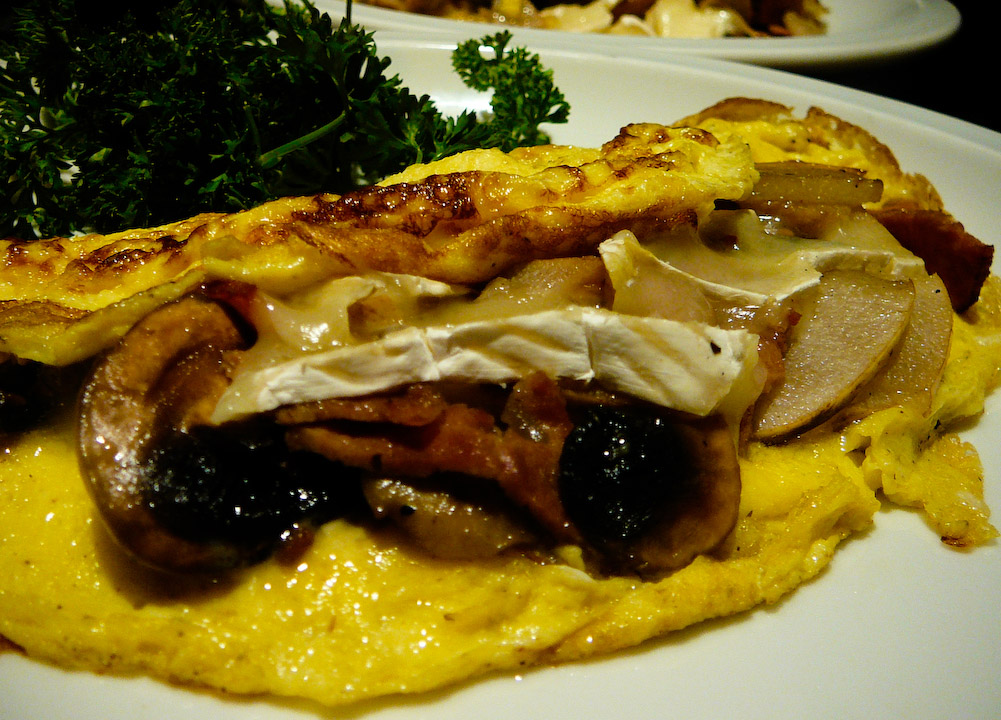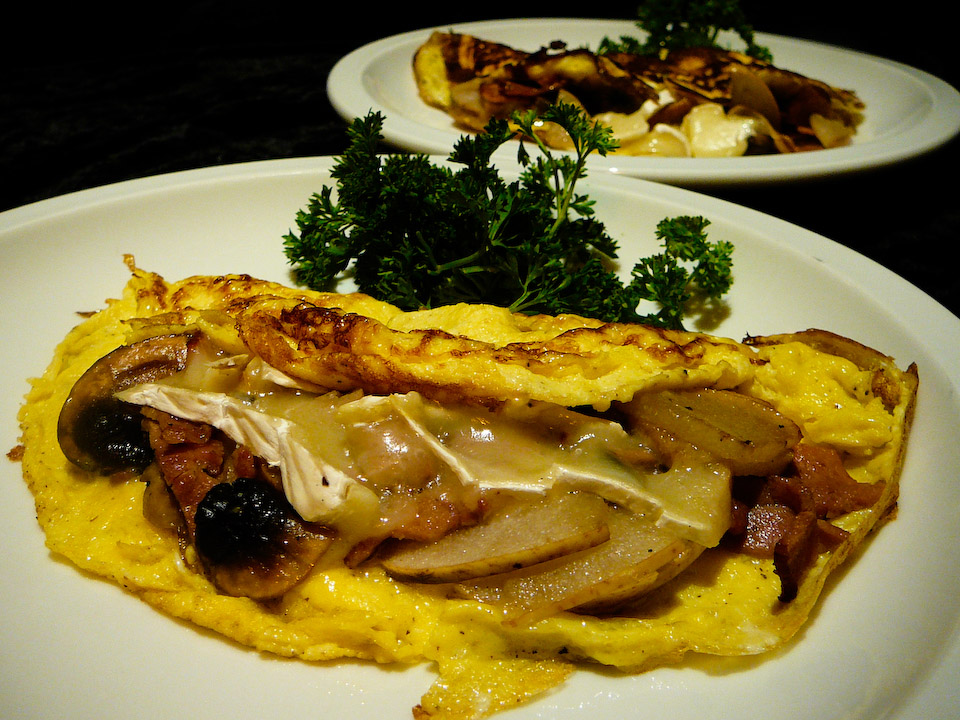Warm up ½ the olive oil in a small non-stick pan on medium heat. Pour in ½ the egg mixture and cook until it is mostly firmed (approx 2 min). Pour in ½ the sautéed contents and Brie and carefully flip over with a spatula.