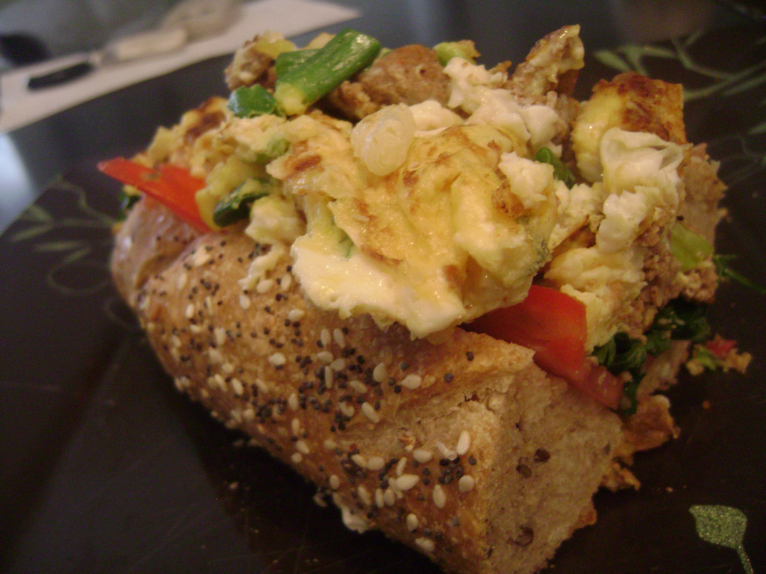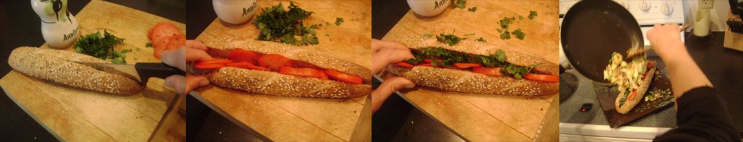 Slice an opening in the top of the baguette and stuff in the tomatoes, parsley and cooked eggs. Slice in half and serve up with the attitude that you already banged once and will again right after breakfast.