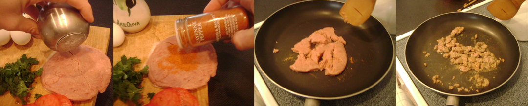 Season the turkey patty with a dash of salt and cayenne pepper. Sauté the meat in a pan, breaking it up into little chunks.
