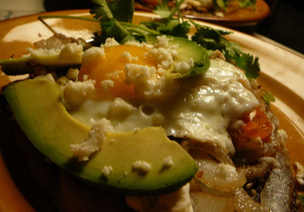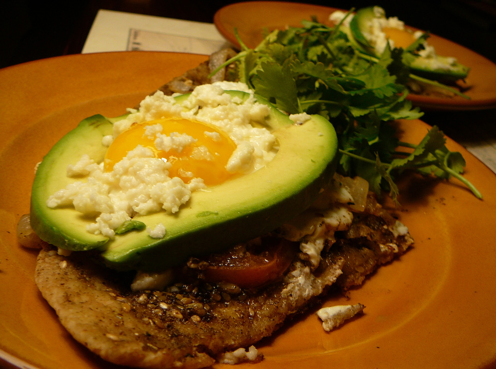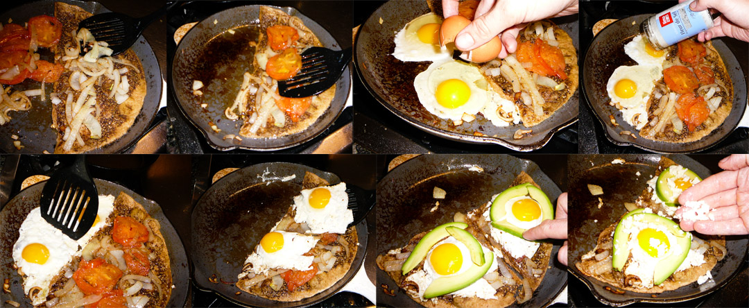 Scoop the fried onions and tomato onto the pita. Crack the eggs in the space now available, salt them, and fry sunny side up (approx 3 min). Split the eggs in two and serve over each half of the pita. Surround the egg yolk with avocado like a halo and crumble some queso fresco on top.