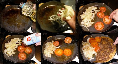 Heat up the oil in a skillet. Throw in the onions and fry until they caramelize (approx 3 min). Fry up the tomatoes next, salting them and flipping once (approx 2 min). Finally make room in pan to fry up pita.