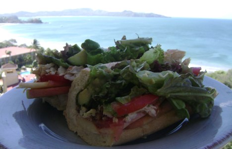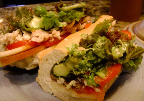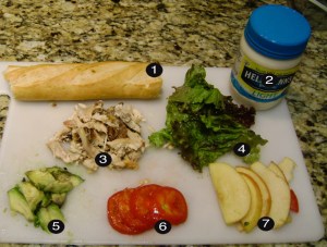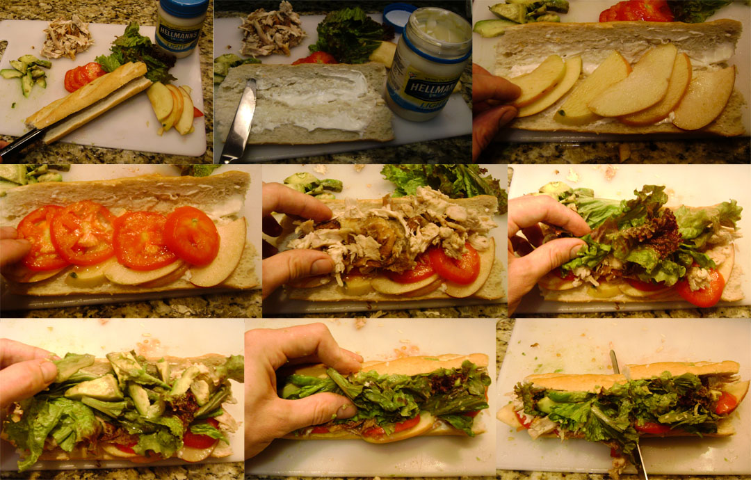 Slice the baguette lengthwise and spread mayonnaise as you wish. Lay out the apple and tomato slices, evenly add the pulled chicken, stuff the lettuce and avocado, and force it all shut. Cut in half and you are ready for just about anything.