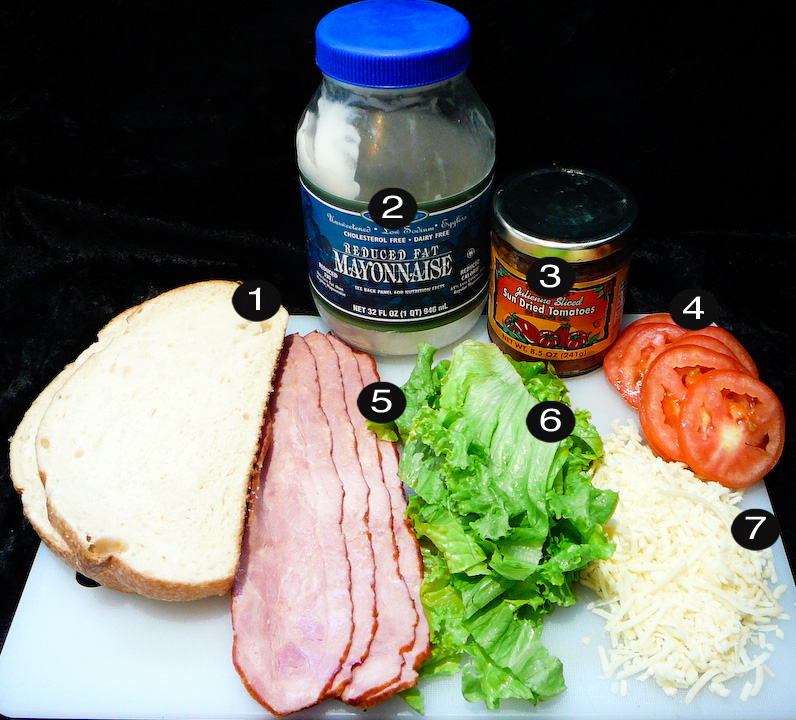Fry the bacon until it’s crispy. Spread mayonnaise and place sun dried tomato over the bread. Lay out the bacon, lettuce and tomato across.