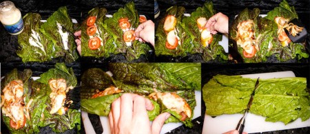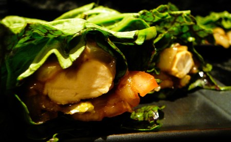 Spread the mayo (if you like) on the lettuce. Evenly lay out the tomato and pear slices. Next add the grilled onions and cooked chicken. Tightly roll the contents up in the lettuce leaf and cut down the middle.