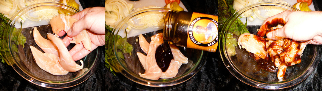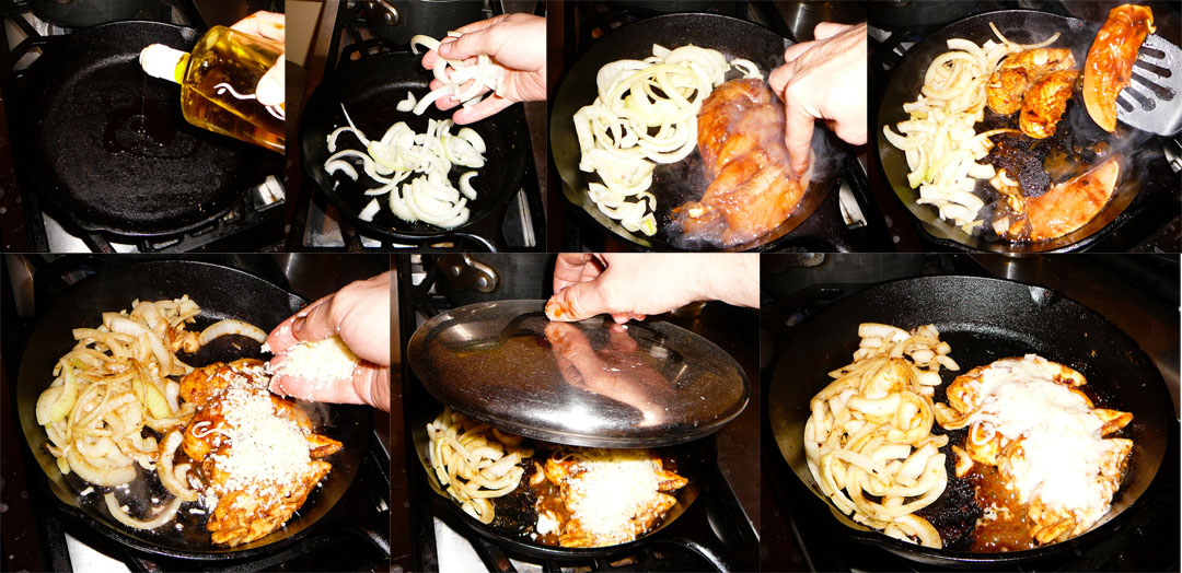 Heat up the olive oil in a pan. Throw in the onion, push to one side, and start grilling. Add the chicken to the other side of the pan. Once the bottom side of the chicken cooks through (approx 2 min), flip and cover with cheese. Cover the pan and cook until the other side cooks and the cheese melts (approx 2 min).