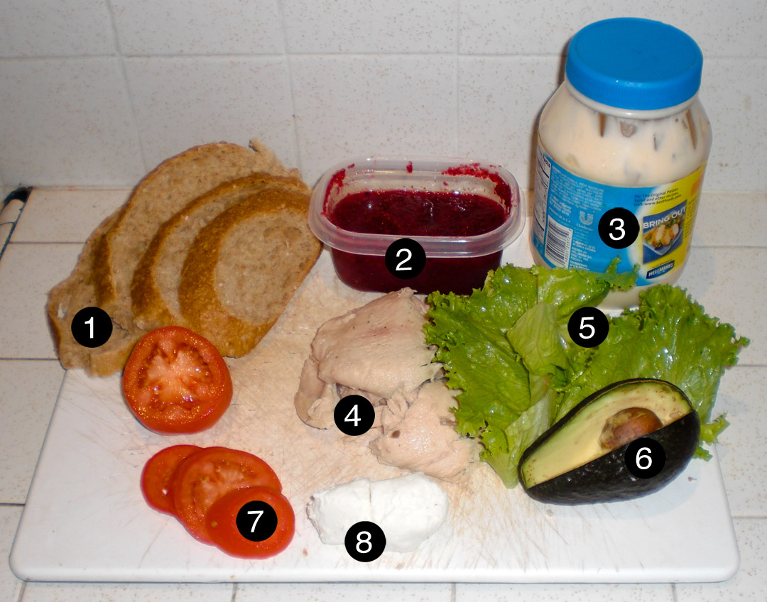 Spread a thin layer of mayonnaise on the dry slice of bread. Place the lettuce, tomato and avocado on it. Turn the cold turkey out onto the cran-cheese side of the bread. Then press the holiday side with the everyday life sandwich side and you have lift off. Drink it down with some naughty eggnog or some wicked hot chocolate.