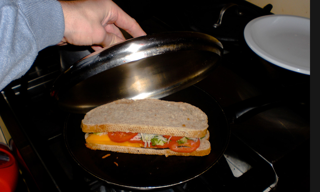 Heat a pan or griddle on medium heat.  Place the uncooked sandwich in the pan or griddle and cover with a lid.  Cook each side, flipping once when each side has browned.  Note: keep an eye on the sandwich because you can easily burn the bread if you are not vigilant.  Serve on a plate with some potato chips, soup, a pickle or a compliment.