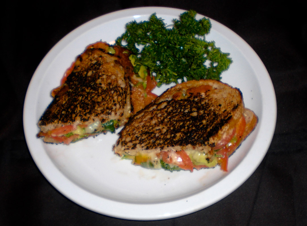 Do you still think of grilled cheese sandwiches as a slice of American cheese thrown between two slices of Wonder Bread?  The grilled cheese has come a long way and wants it’s day in court to appeal.  Be an honorable judge and listen to the cheese plead its case as it melts on your tongue, accompanied by evidence in the form of tomato, avocado and cilantro.  Only a cruel monster lacking in taste bud ethics could throw the book at a sandwich so deviously divine.  I found this extreme makeover on a childhood classic to be an effective weekend lunch date meal.  Grill these babies up, pop in a movie, pretend to yawn and throw your arm around your date.  If your game is strong, the vibe is on, than you should be knocking boots ‘til the break of dawn.