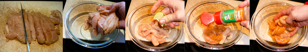Slice the chicken breasts into long thin strips and marinate in limejuice and 1/2 the fajita