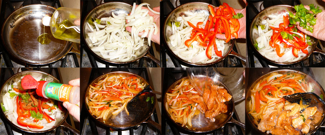 Sauté the onion, bell pepper and cilantro in olive oil until they soften (approx 4 min). Create room in the pan and sauté the chicken next to but separate from the veggies (approx 3 min).