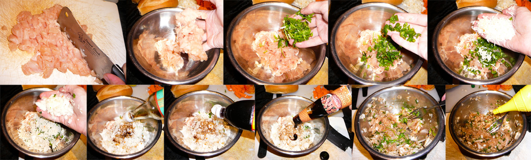 Mince the chicken and then marinate with cilantro, chili, onion, coconut, soy sauce, fish sauce, oyster sauce and lemon juice (approx 15 min).