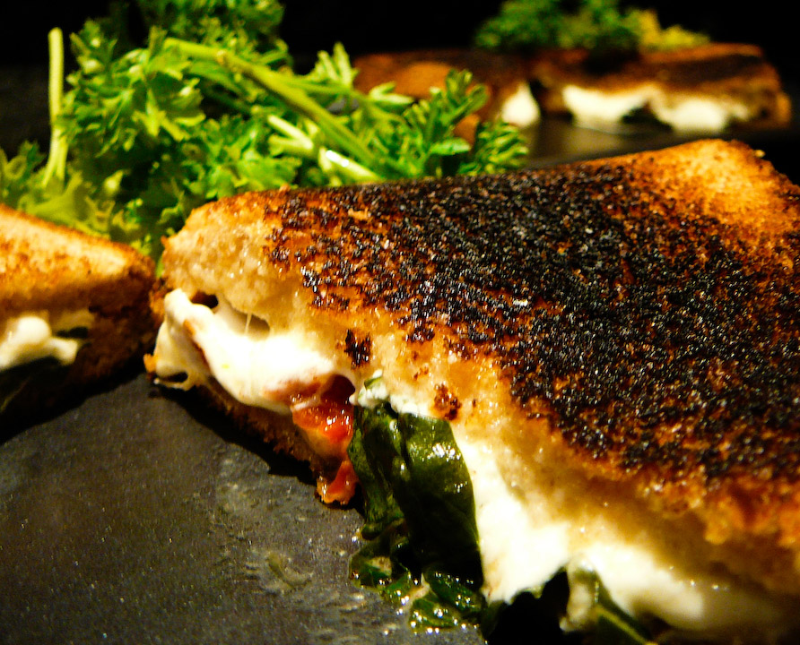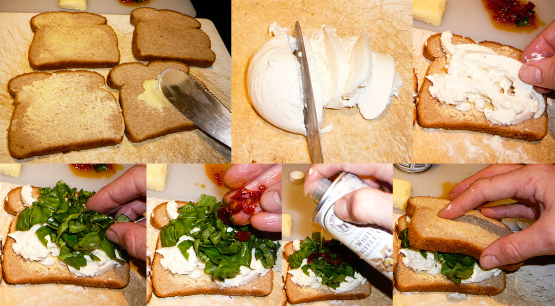 While CTB has already done the GRATUITOUS GRILLED CHEESE SINWICH to great fanfare, one gourmet grilled cheese sandwich just isn’t enough. Anyone whose been to a grilled cheese contest can tell you there’ more than one way to melt congealed milk. At the GRILLED CHEESE INVITATIONAL, I learned that there are as many variations on the grilled cheese as positions in the Kama Sutra. Since CTB is not about to make grilled cheese the exclusive format, allow me to present this grilled piece of awesome for your dining pleasure. In the interest of full disclosure, I just got truffle oil and am totally and positively gay for it. A little dab works like a super lube, revving up the sexy time explosions in your mouth. Alas, I applied the glorious oil to a grilled cheese lunch. I took my first bite while standing and nearly lost my footing. Luckily the girl I was cooking for was able to break my fall or I would have knocked over the precious truffle elixir and likely licked it straight off the floor. By the time we gobbled down our sinwiches, we danced a shuffle from the kitchen into the bedroom without bothering to wash our hands first.
