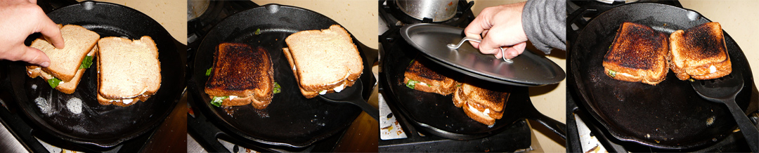 Get the pan nice and hot on medium heat first and then throw the sandwiches down. Brown one side of the sandwich, flip, and cover with a top. Cook until the cheese melts and the other side browns (approx 4 min). Slice in half and serve.