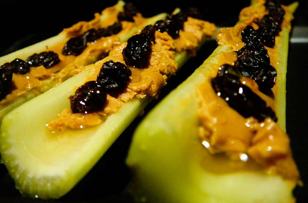 Fill each celery rivet with peanut butter. Place raisins intermittently over the peanut butter. Drizzle honey as you wish over it all and serve up this childhood snack gone wrong.