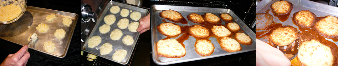 Grease baking pans and then use an ice cream scoop or large spoon to scoop out cookies into balls. Leave plenty of room between cookies. Bake until the tops brown (approx 35 minutes), allow to cool and harden (approx 10 minutes), and then gently pry the cookies off with a spatula and serve.