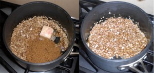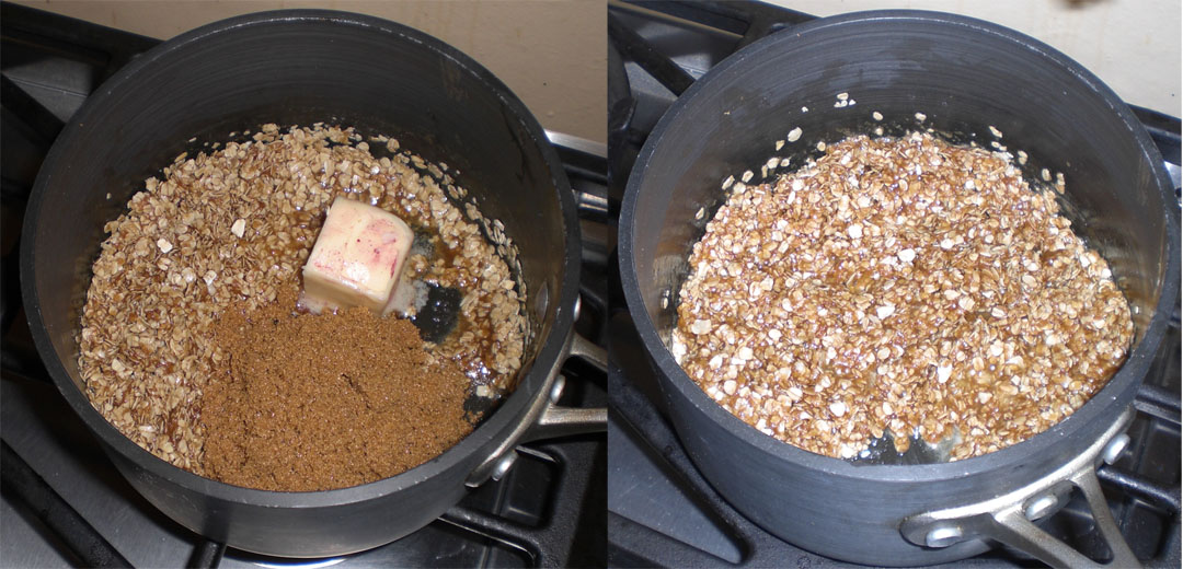 On low heat, melt the butter in a saucepan. Throw in the brown sugar and stir until it becomes the consistency of gooey molasses. Add the oats and stir so the oats begin to cook and expand.