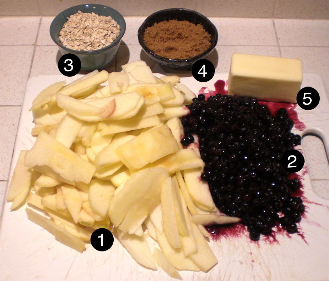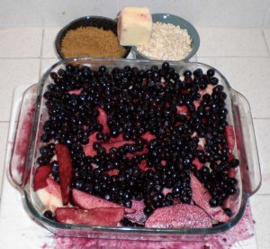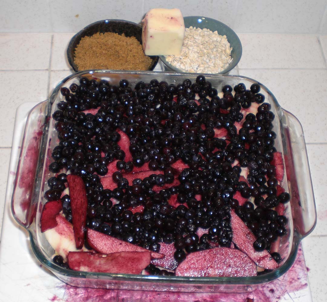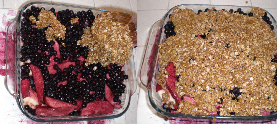 Cover the apple/berry mix with the brown-sugary oats so you have a think crust over the entire dish.