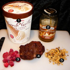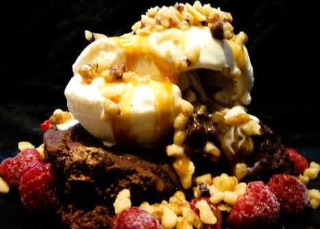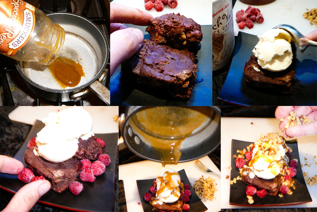 First heat up the butterscotch. Lay a brownie bed, scoop ice cream on top, surround with raspberries, pour over the hot butterscotch, and crown with walnuts and go nuts!