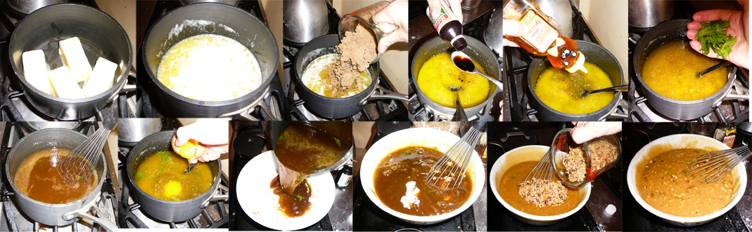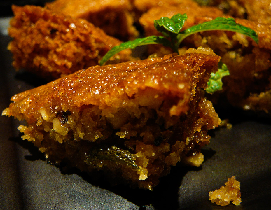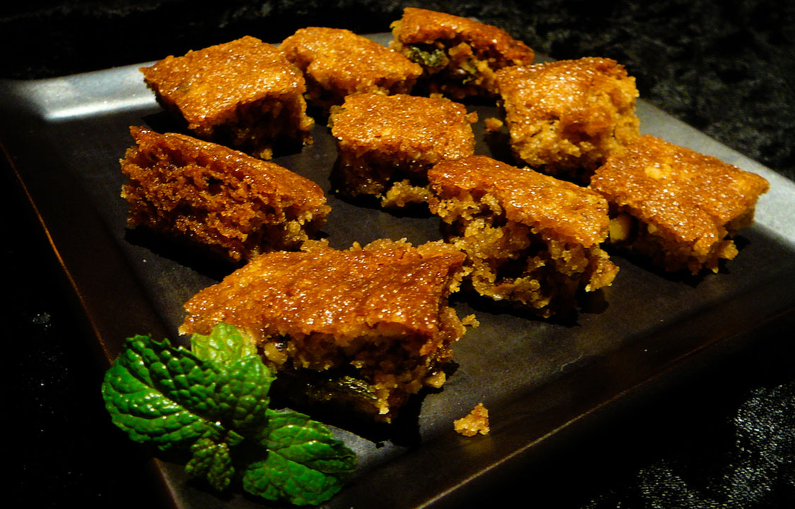 Melt the butter down and mix in the brown sugar, vanilla extract, honey, mint leaves and eggs. Combine this mixture with the sifted flour mixtures. Add the walnuts and whisk it all together.